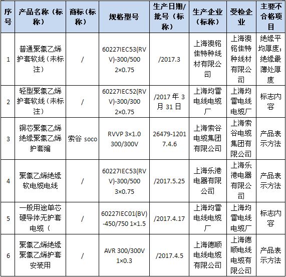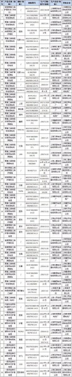 2017年上海市額定電壓450/750V及以下聚氯乙烯絕緣電線(xiàn)電纜產(chǎn)品質(zhì)量監(jiān)督抽查不合格產(chǎn)品